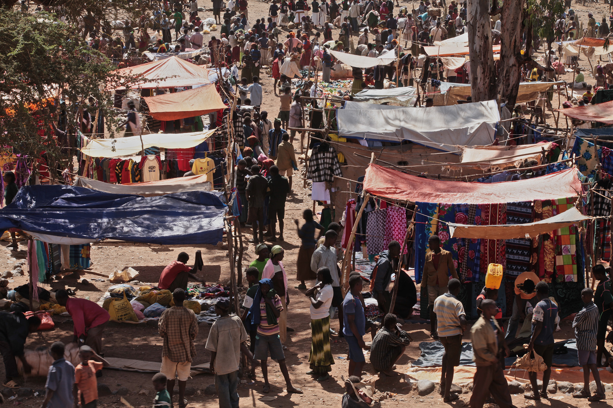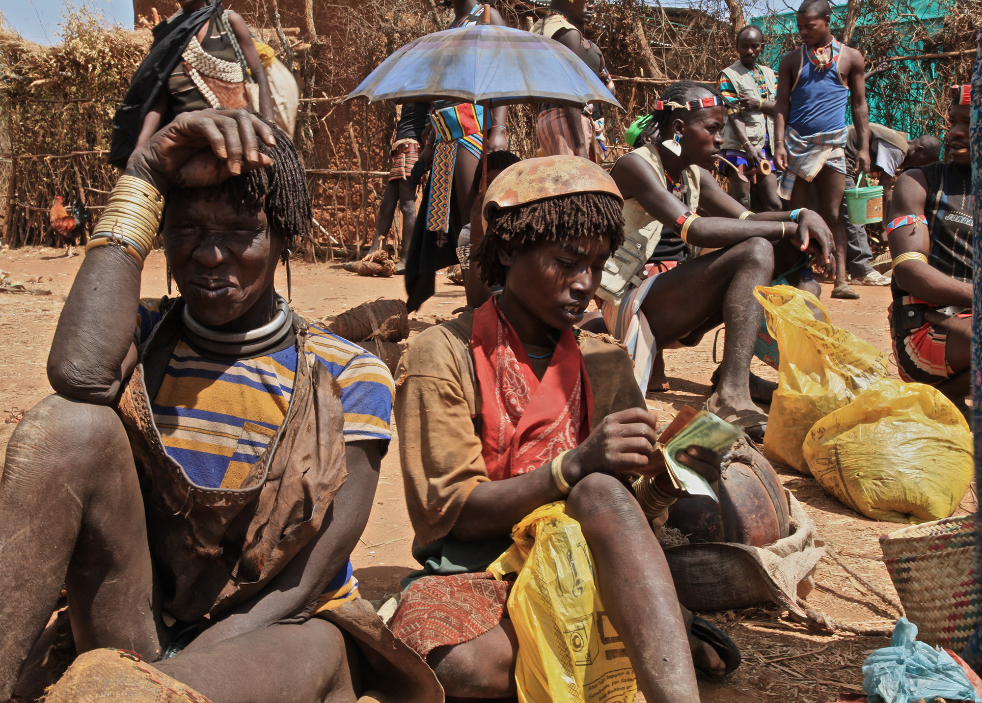 Market day in Dimeka, a small village in southwest Ethiopia. Members of the Hamer ethnic group meet once a week to offer their products. Ami sells reddish powder made from natural extracts. It is used to color hair. The product is mixed with water and butter, applied and not washed out again. Braids are twisted. The so-called “Goschas” lie on their heads like clay. For weeks, for months. They are a symbol of wealth and health. The color stands for beauty. As in western cultures too. Ami’s products are in great demand.